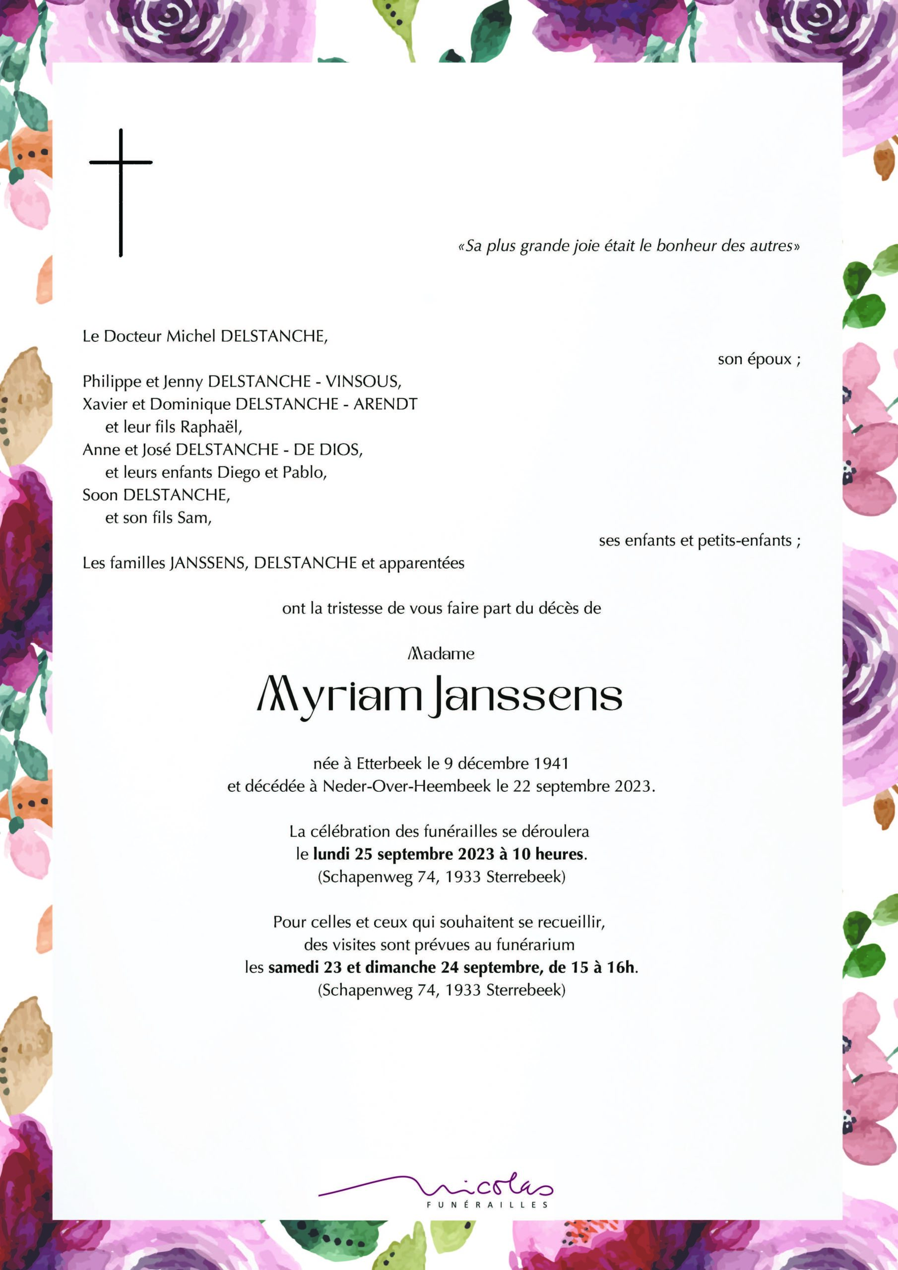 Madame Myriam JANSSENS, épouse du Docteur Michel DELSTANCHE